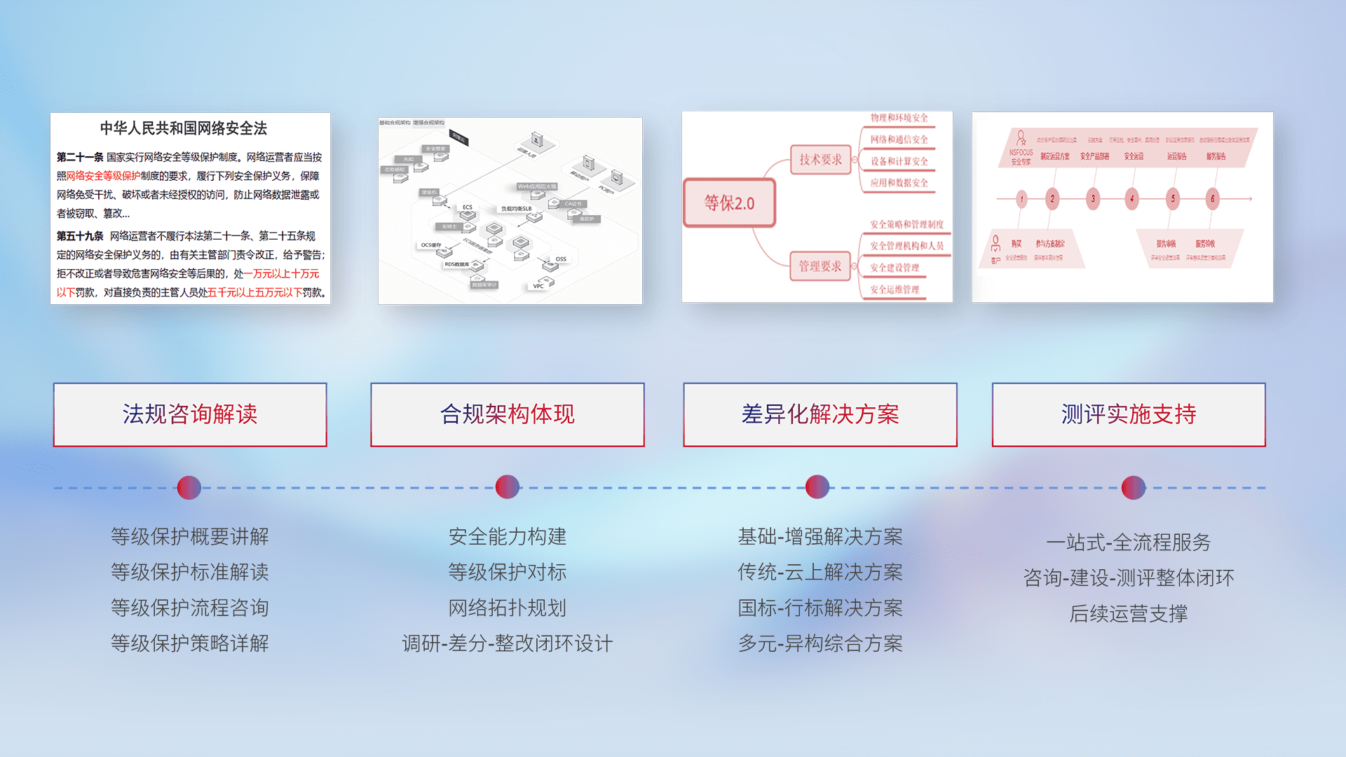 通过专业的法律咨询解读、、、、合规架构体现、、、、差异化解决方案、、、测试实施支持等服务,,,,为客户量身打造等保合规体系。。